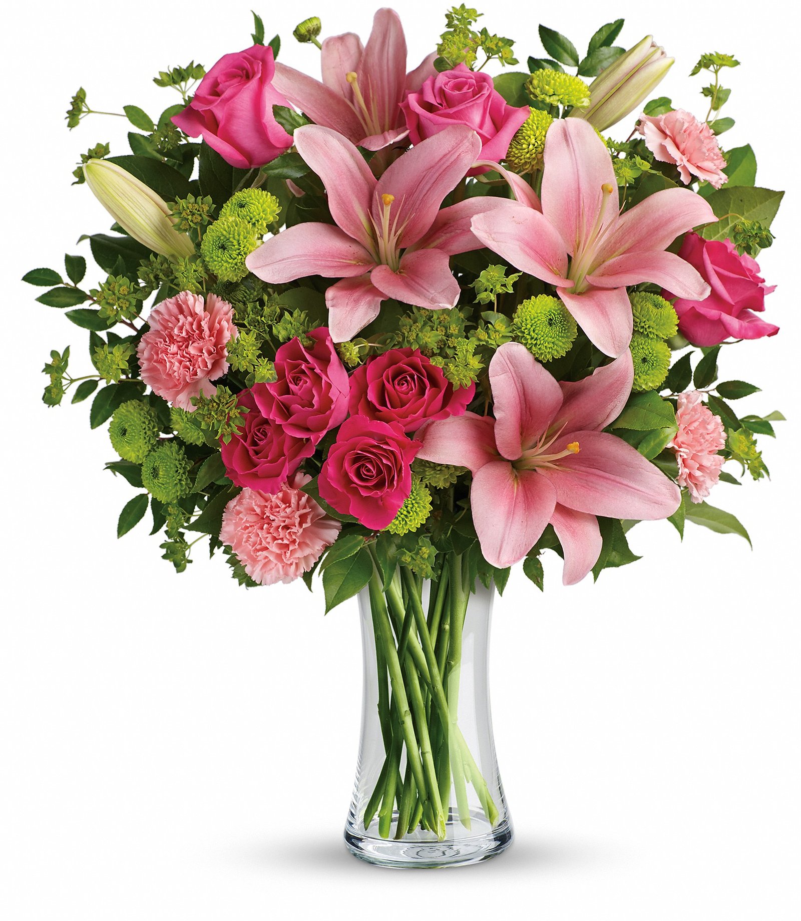 What's better than pink? More pink! This blissful bouquet of roses and lilies is arranged and delivered by the Flowers by Giorgie team in a classic glass vase. This flower arrangement is sure to put some pink in their cheeks and a smile on their faces!