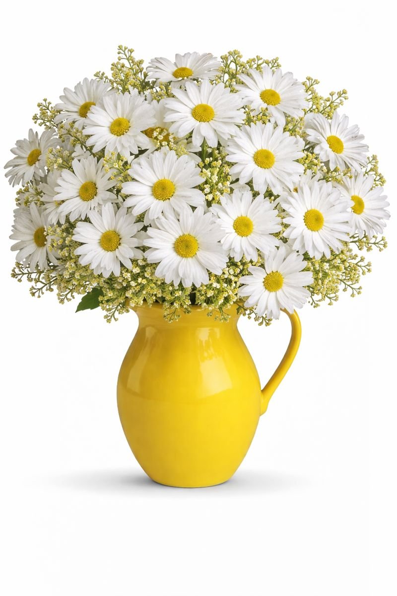 Sunny Day Pitcher of Daisies is a vibrant summer arrangement inspired by sunshine, warmth, and easygoing days. Bright blooms and fresh seasonal colors come together to capture the joyful spirit of summer.
