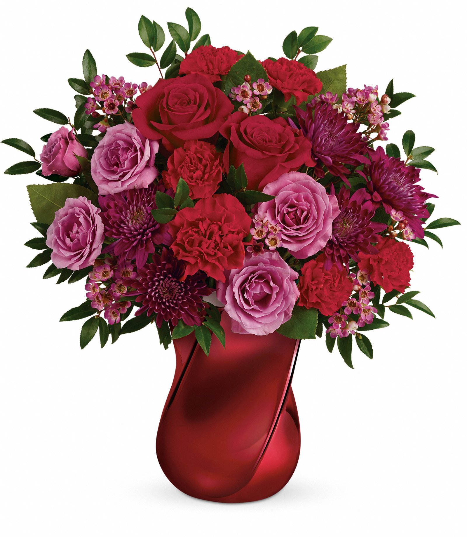 Spoil your crush this Valentine's Day with a luxurious red and lavender bouquet, arranged in a stunning crimson ceramic vase with modern twisted design.