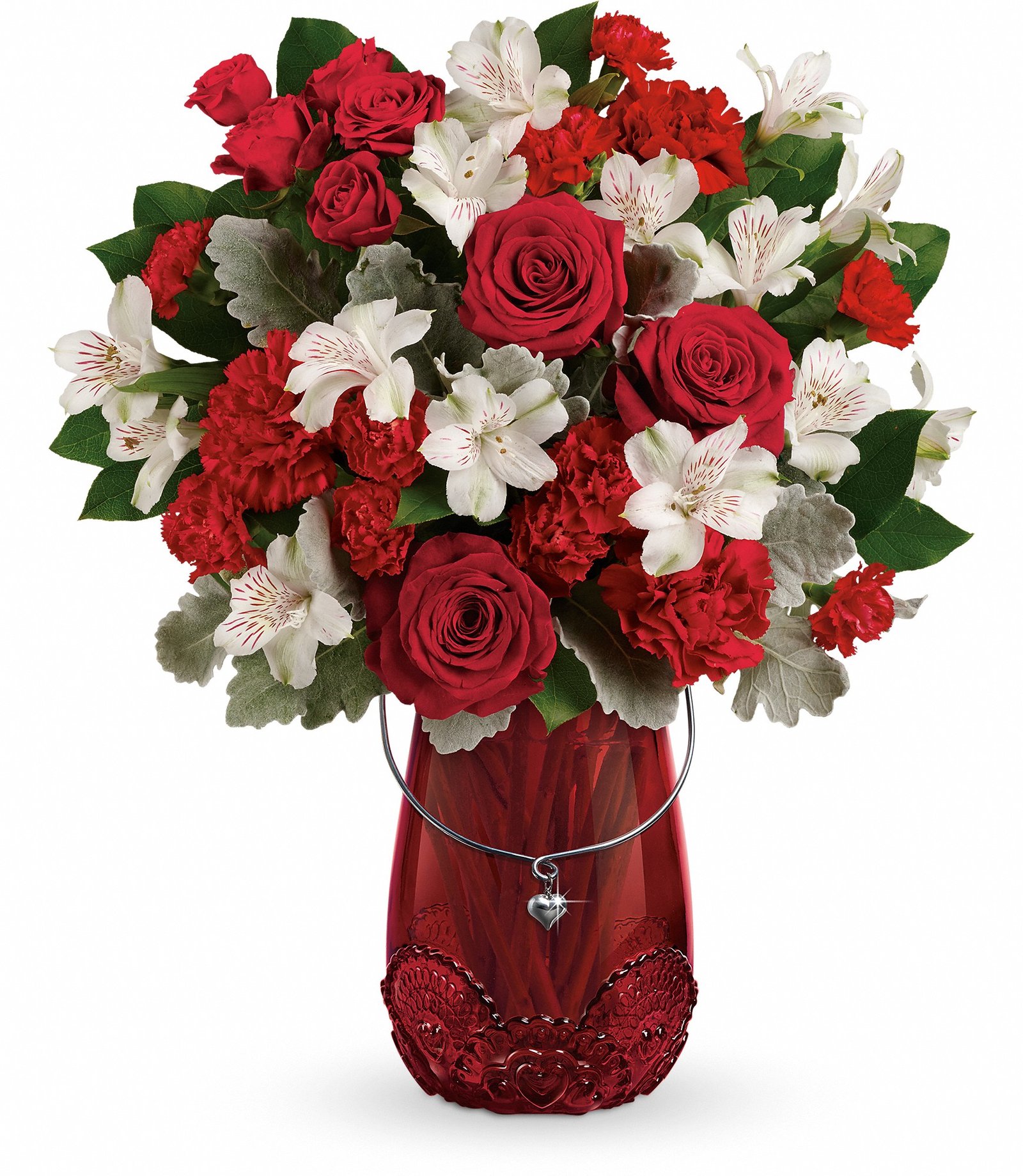 Take their breath away with this passionate rose bouquet, presented in a keepsake glass lantern vase with beautiful lace detail and sparkling heart charm.