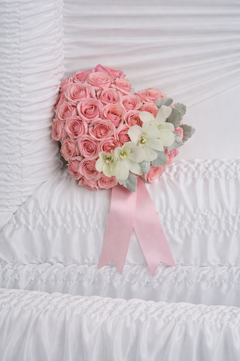 Adorn the casket with this touching heart of precious pink roses and delicate white orchids, a loving tribute to a very special life.