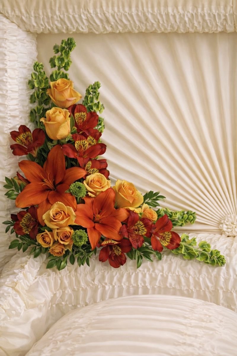 The warm hues and luxurious flowers of this sympathy arrangement communicate your condolences in a most heartfelt way. With roses, lilies and alstroemeria, it’s a lovely choice for the casket.