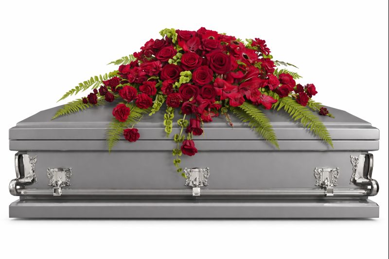 Deep reds and tranquil greens both pay respect and convey heartfelt feelings at a time of loss. Traditional yet timeless, this elegant funeral arrangement is ideal for an open or closed casket.