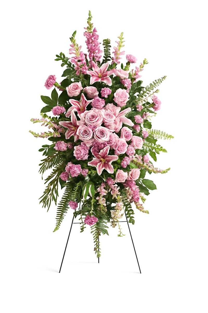Glorify a life well-lived with this magnificent spray of pink hydrangea, roses and lilies–a radiant, reflective celebration of her beauty and love.