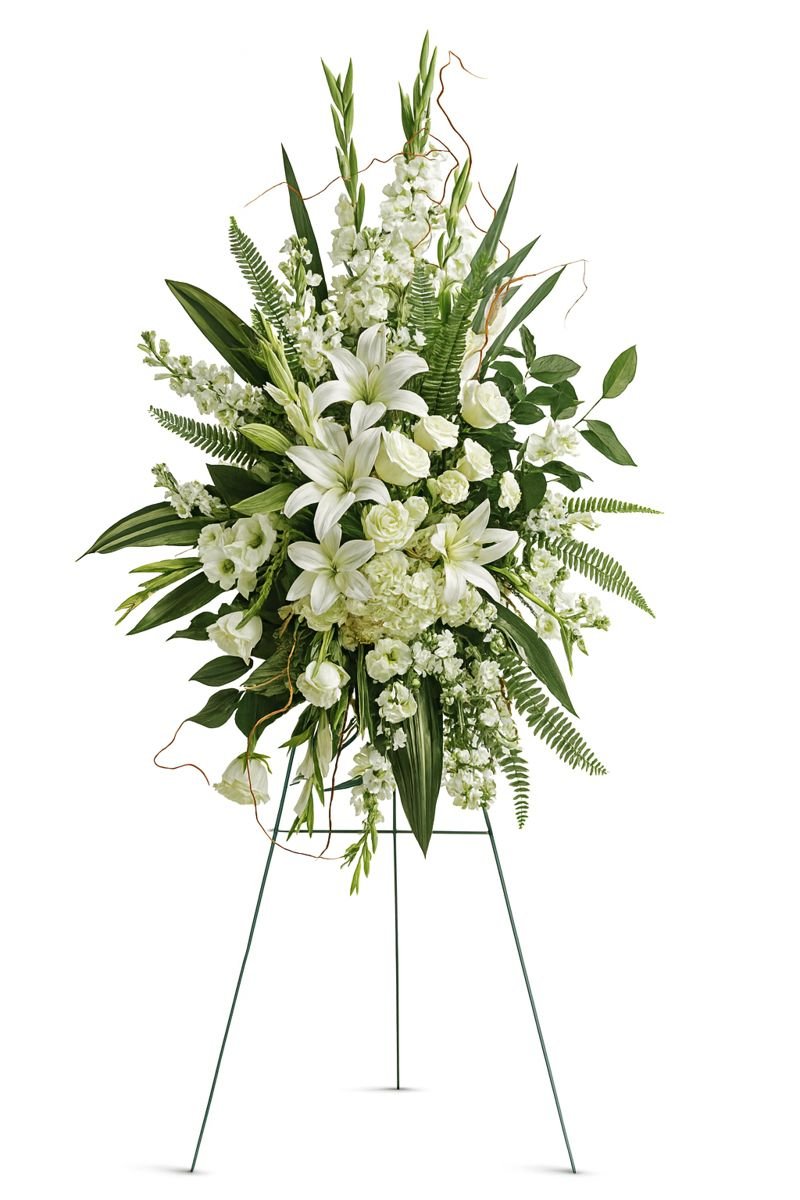 A peaceful display of your heartfelt sympathy, this pure white spray of hydrangea, roses and lilies brings a natural serenity to the service.