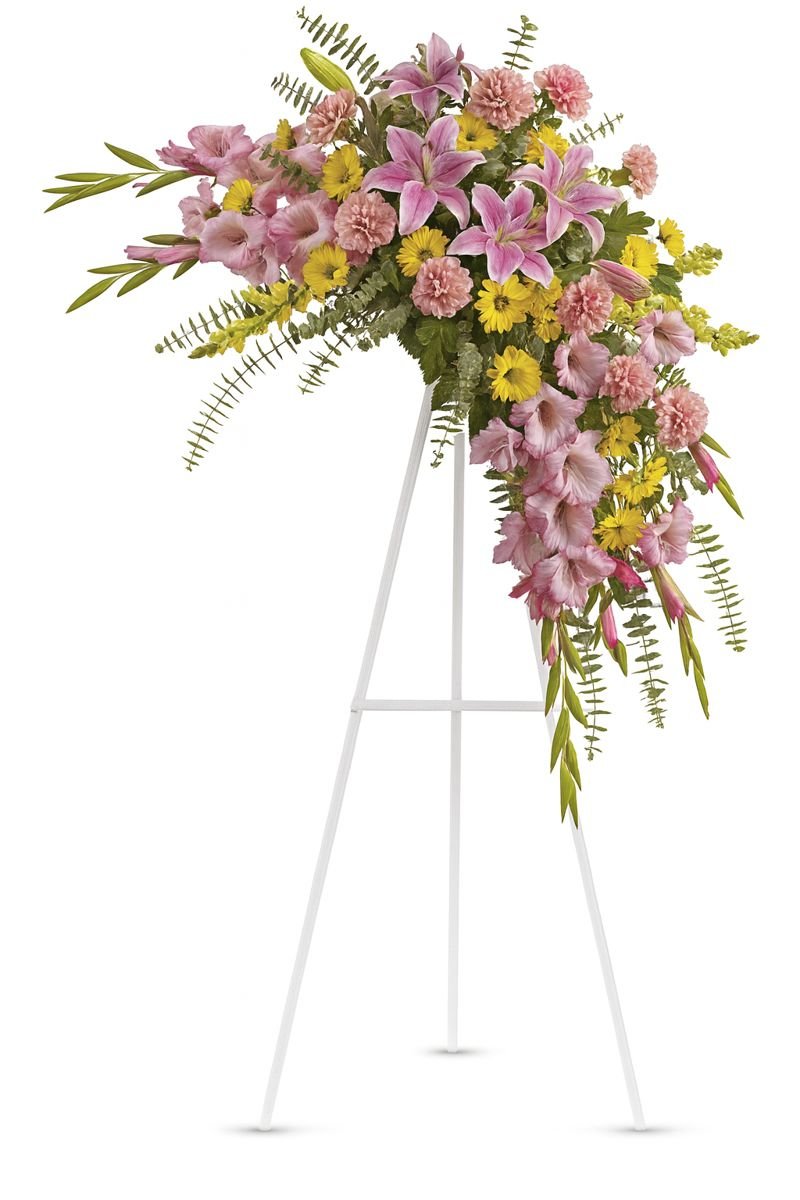 Soft, soothing pink lilies and yellow daisies are crafted into a crescent standing spray – what a lovely remembrance of your friendship, and perfect selection for a memorial service.