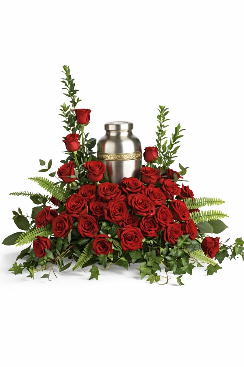 An elegant tribute to a rich, radiant life, this breathtaking bouquet of resplendent red roses and delicate greenery makes a beautiful presentation of the cremation urn.