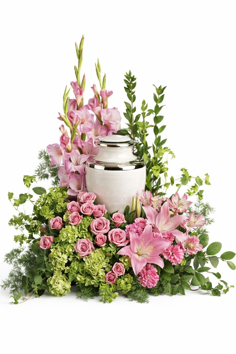 Honor the cremation urn with this pristine pink arrangement of hydrangea, roses and lilies, a soft, feminine tribute to an inspiring life.